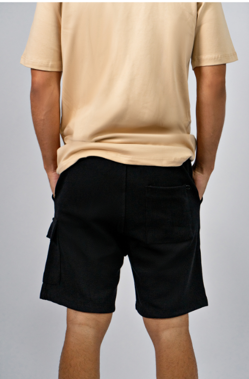 A Bermuda Cargo Masculina em Malha Piquet Preta une conforto, bolsos funcionais e um visual moderno.