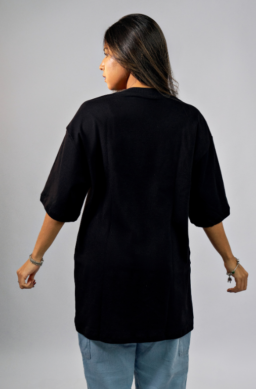 Camiseta feminina oversized na cor preta, feita em algodão premium, com caimento amplo e design moderno. Essencial, versátil e perfeita para qualquer ocasião.